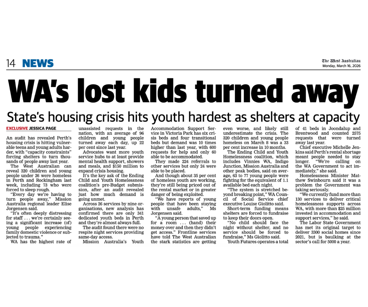 We are proud to stand alongside peak bodies Shelter WA, WACOSS and YACWA, and service providers including Vinnies WA, Mission Australia, Indigo Junction, Anglicare WA, Perth Inner City Youth Service, St John of God, and the WA Alliance to End Homelessness in calling on the State Government to commit $150 million to ending child and youth homelessness.